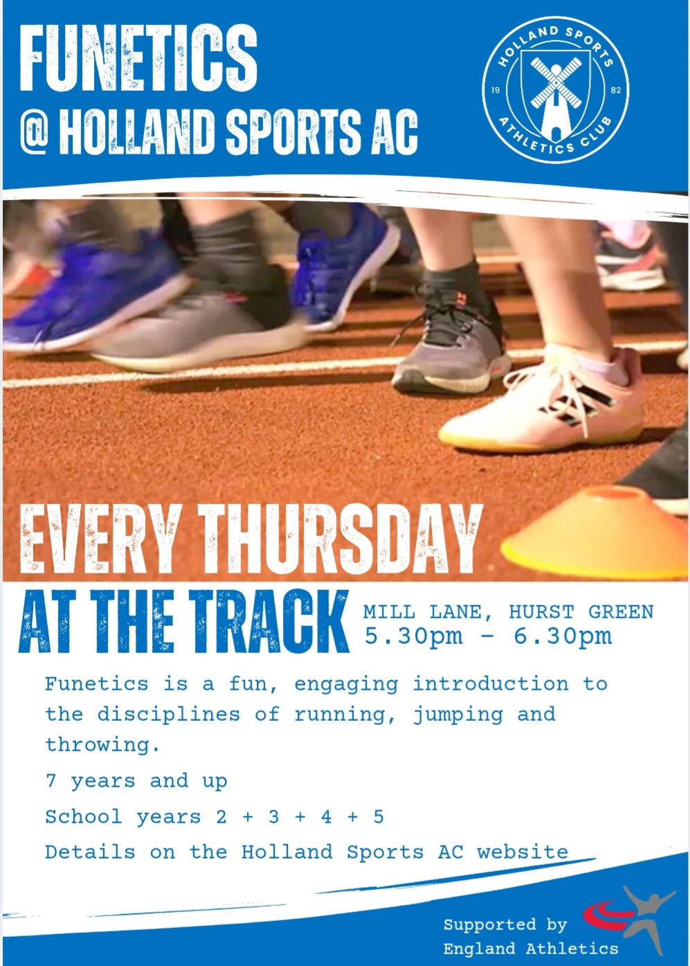 Funetics is England Athletics introductory programme to Track and Field for children of 7 years and up. Holland Sports Athletics Club is proud to announce that we will be starting Funetics sessions on Thursday 16th April, running weekly to Thursday 9th July.